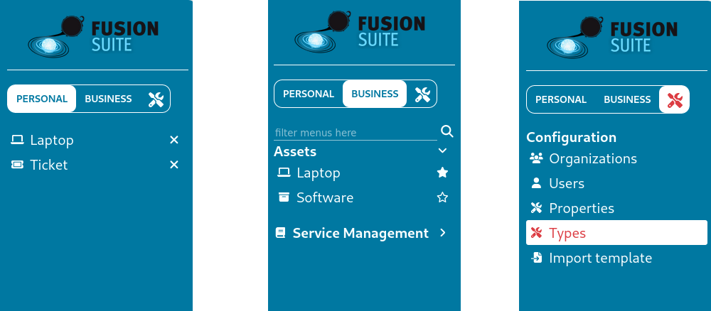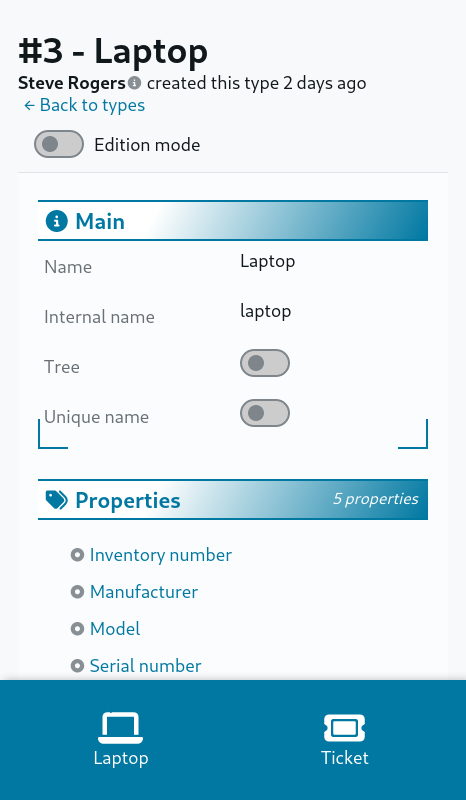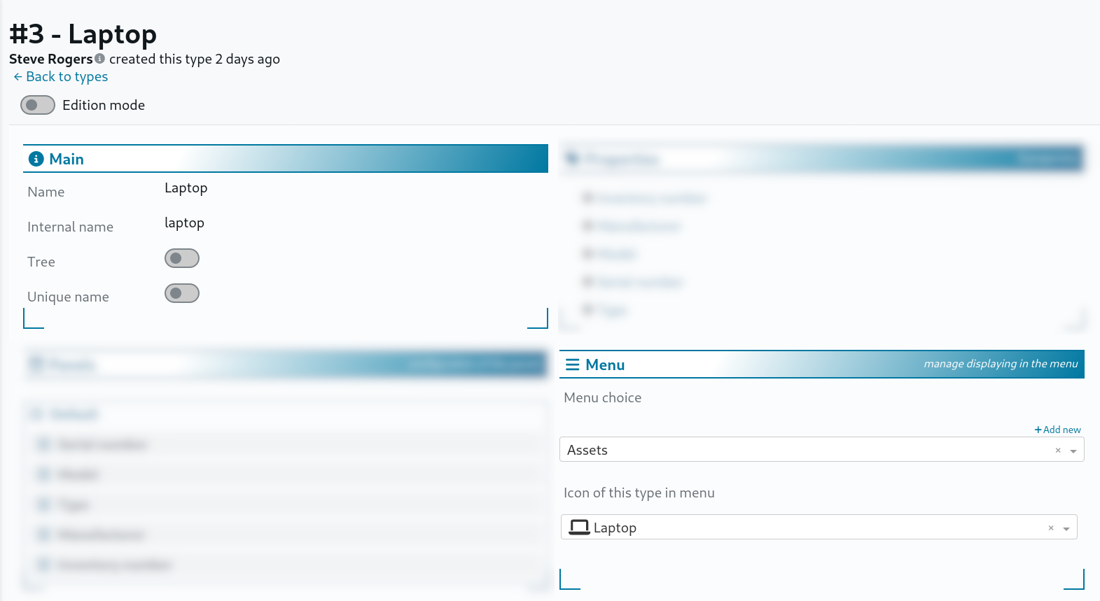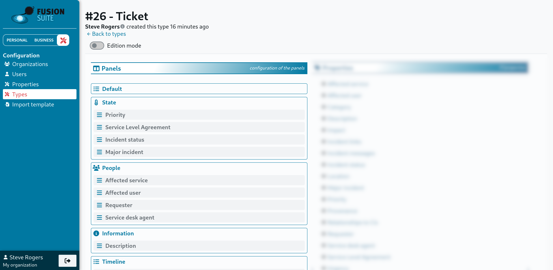 For each type of item (tickets, laptops…), it is possible to create several panels and put certain properties in them. This is done through a drag and drop in the item type configuration: